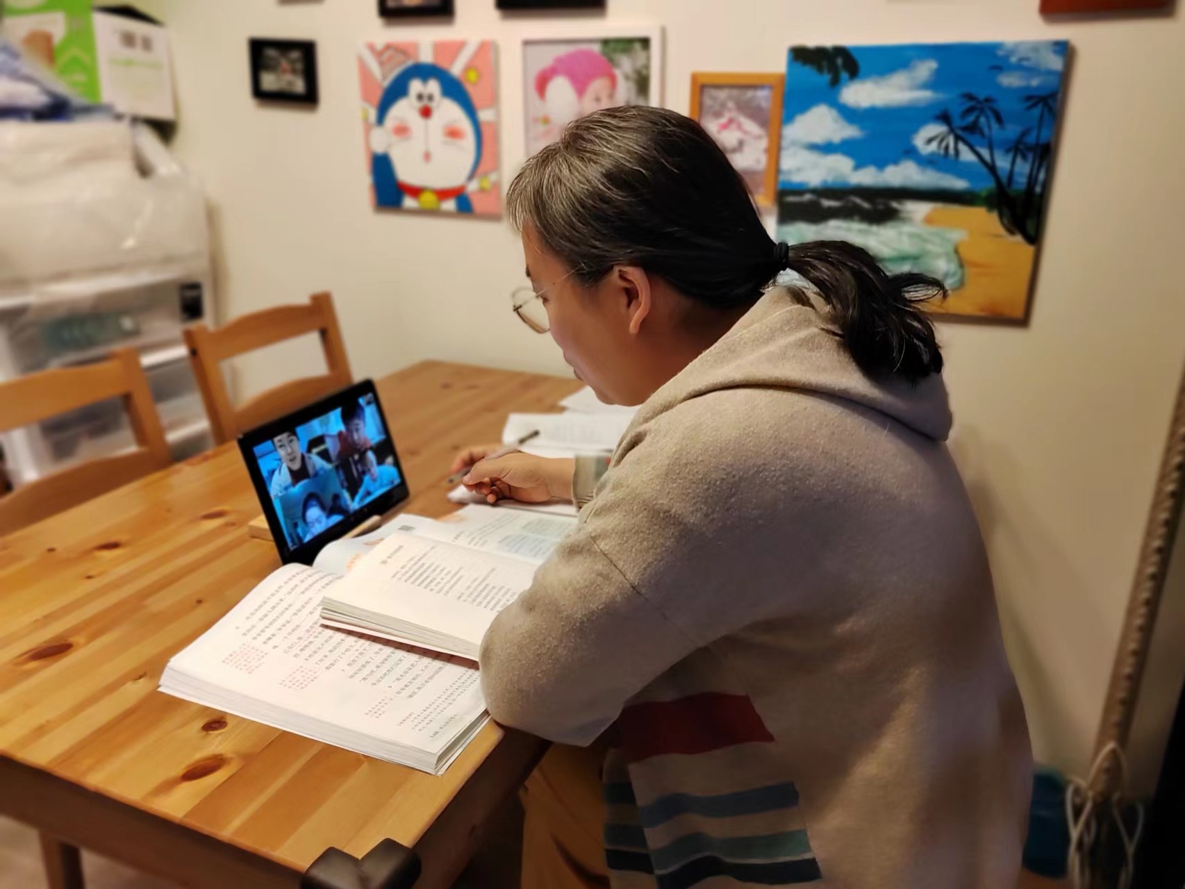 上课期间,一般是倪小梅在大卧室、李伟在小书房,大女儿则在自己的房间,彼此之间互不干扰,忙着各自的课堂。但这个时候,小女儿就处于无人看管的状态,住在附近小区的姥姥就会来到李伟家中,在客厅照看起外孙女。有时候小女儿醒得晚,需要倪小梅先到客厅上课,姥姥在卧室看孩子,等到孩子醒了再换回来。
