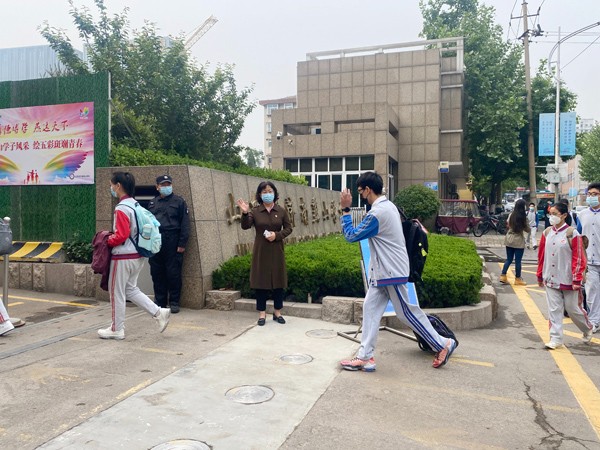 早上七点,在济南市天桥区晏阳初中学,学校领导、校门护学岗教师及保安人员便早早守候在校门口,等待初中毕业年级学子们错峰返校,严格把控入校第一关。同学们带着承诺书,按照学校设置的“一米线”依次保持间隔,通过校门口自动测温设备后有序入校。济南市槐荫区实验学校的老师则手持精心制作的标牌欢迎同学们的到来,共同开启初中阶段最后一个月的学习生活,备战即将到来的中考。