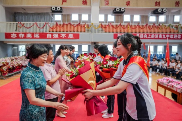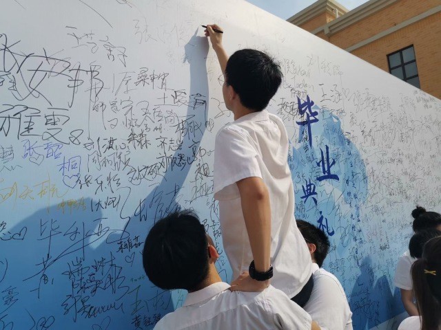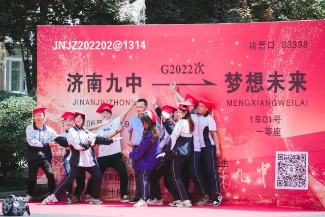 在济南一中的2019级毕业典礼上,全体学生躬身鞠躬,向陪伴他们三年辛苦付出的老师行古礼、谢师恩。高一高二的学弟学妹们也纷纷为师哥师姐加油。在济南外国语学校,学校制作了创意巨型车票,始发站是学校,终点站是未来,学生们在展板前签字留念,那一刻写下的,是回忆,更是梦想。