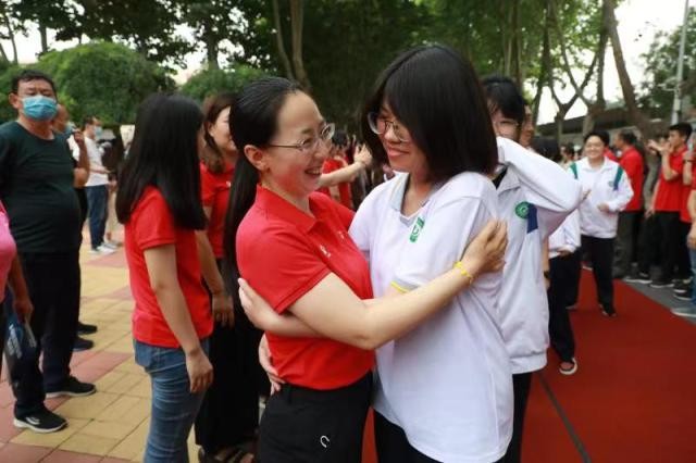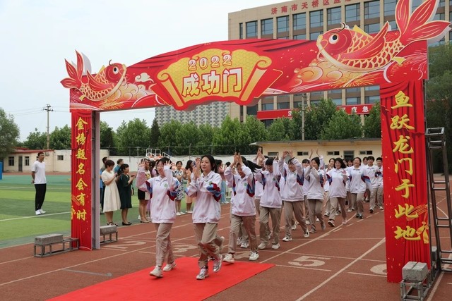 在济南大学城实验高级中学,高三学子整齐排列,跨过“旗开得胜、金榜题名”“蟾宫折桂、连中三元”成功门,与校长郑玉香逐一击掌,传递鼓励与祝福。