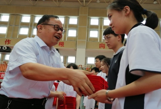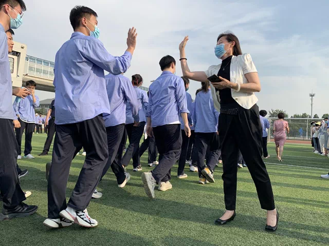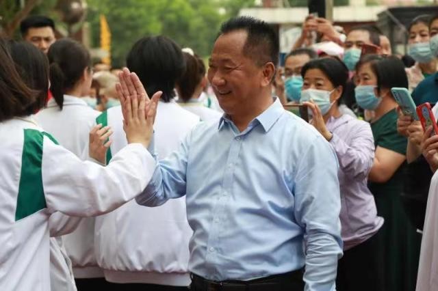 济钢高中党委书记、校长邢文明与学生击掌加油