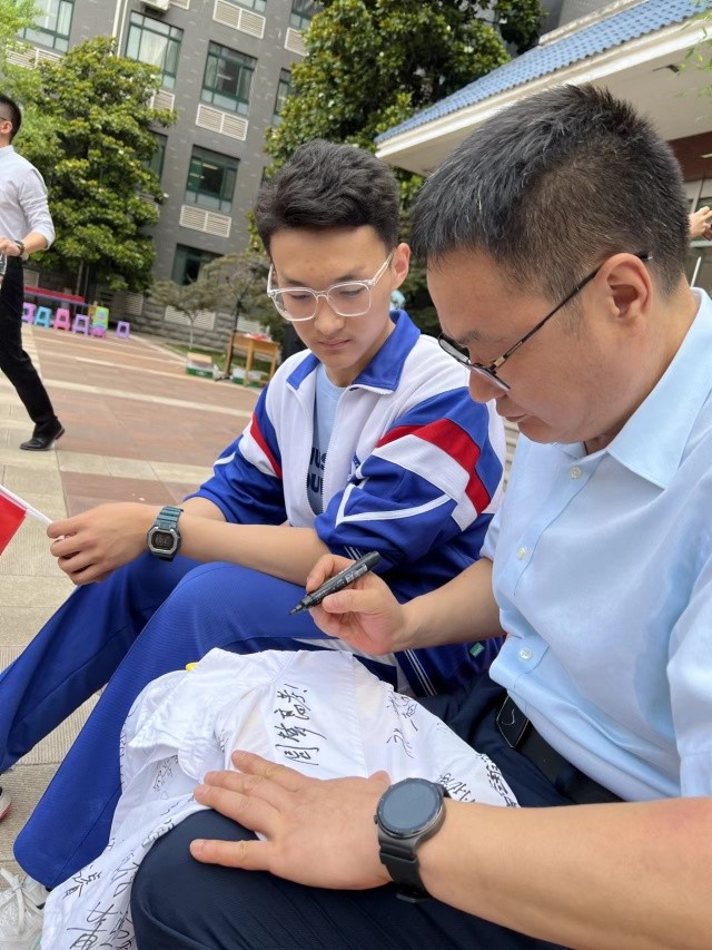 济南一中校长逄坤敬在校服上给学生写下祝福 山东商报·速豹新闻网记者 张雯雯 通讯员 陈兴华 摄