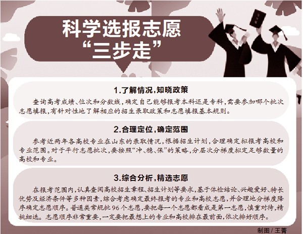 有了高考成绩、分数线、一分一段表以及往年的录取数据和招生计划,考生们可以着手准备志愿填报了。志愿填报注意啥?具体分哪些步骤,在6月25日下午举行的新闻发布会上,山东省教育招生考试院新闻发言人、副院长李春光给出提醒。