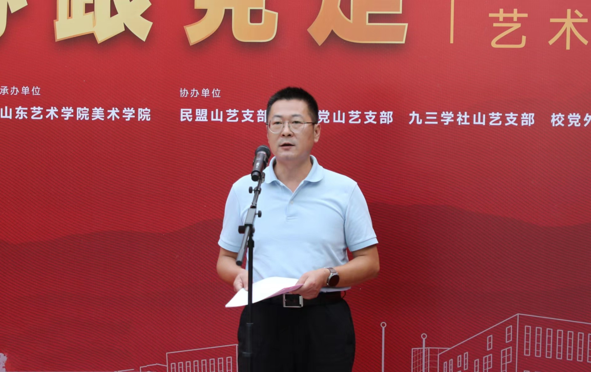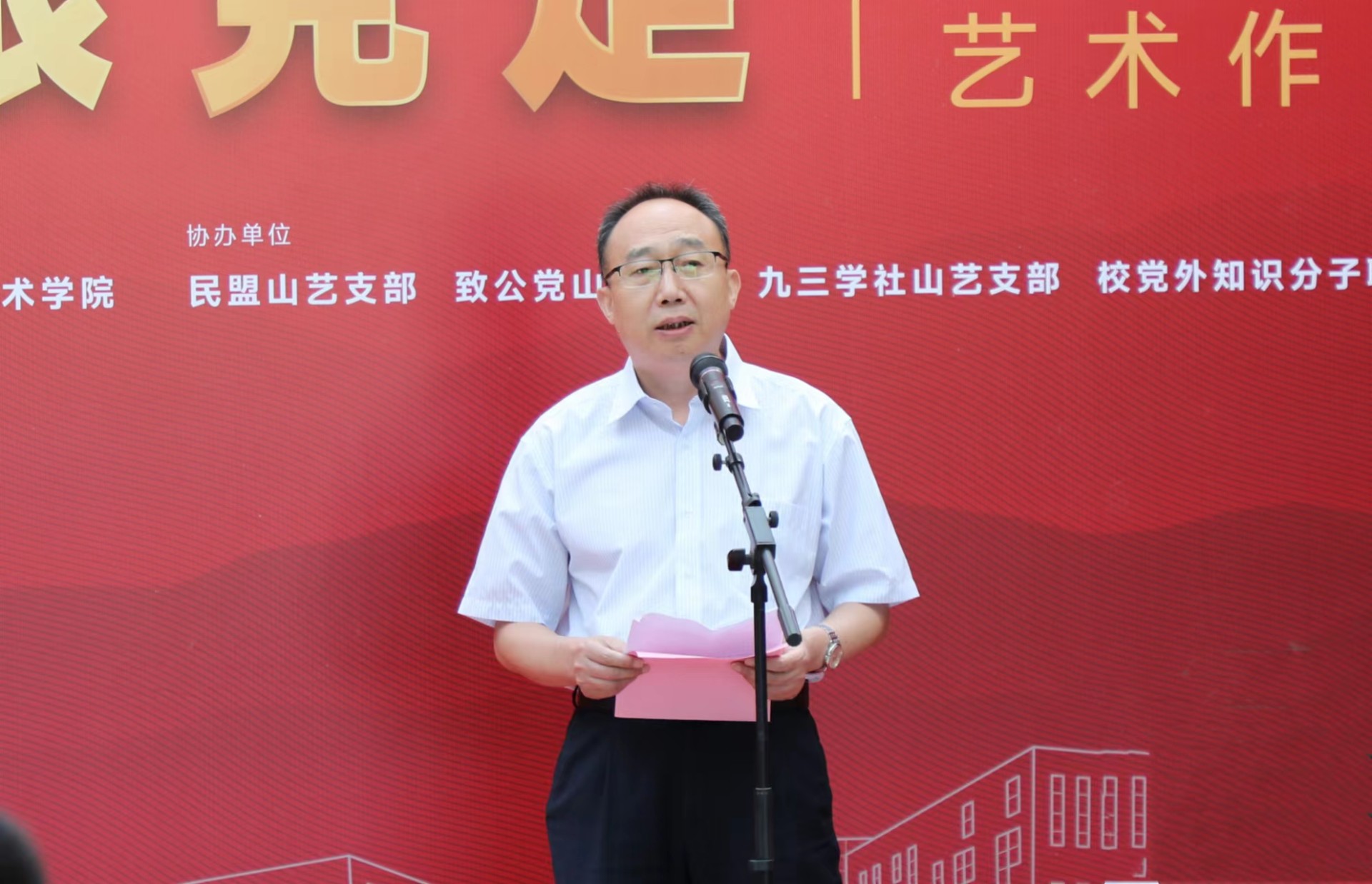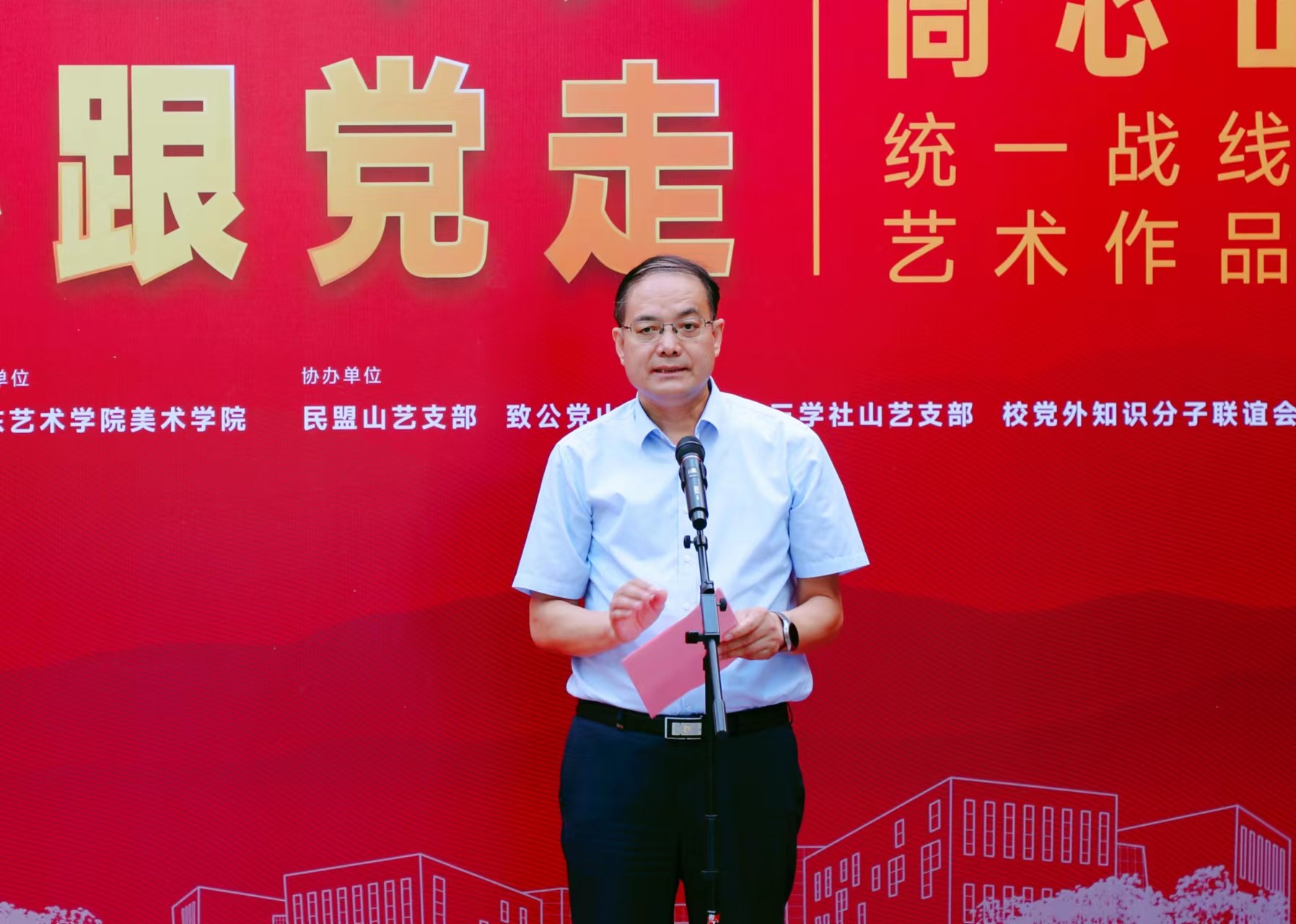 开幕式上,省委统战部五处处长、一级调研员修鲁彬结合新时代统战工作的需要,提出几点希望。希望学校以艺术展为契机,进一步加强党外知识分子的思想政治引领,凝聚思想共识,在拥护“两个确立”、做到“两个维护”、增强“四个意识”、坚定“四个自信”上与党同心;以成功举办主题艺术展为新的起点,进一步激发广大师生创新创造激情,紧紧围绕山东“走在前、开新局”的部署要求,在社会主义现代化强省建设进程中,建言献策、与党同行。