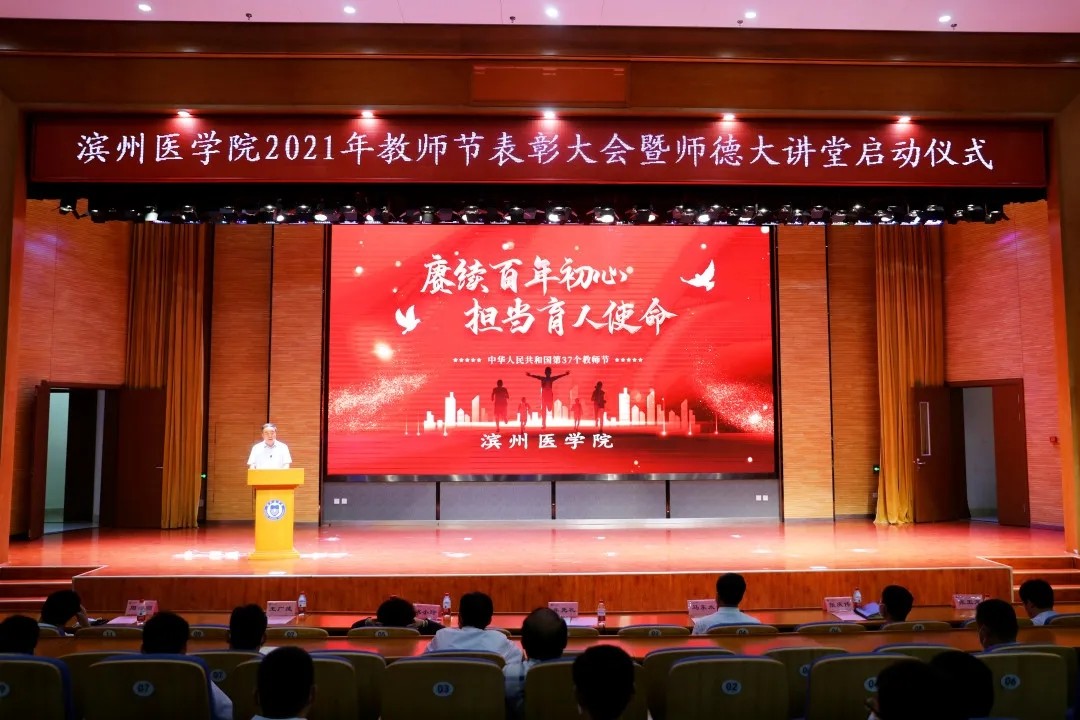 9月10日,是全国第37个教师节,主题是“赓续百年初心,担当育人使命”。9日下午,学校2021年教师节表彰大会暨师德大讲堂启动仪式在荣祥楼报告厅举行。校党委书记车先礼发表讲话并与全国师德先进个人、北京航空航天大学教授、博士生导师姚小玲共同为“滨医师德大讲堂”揭牌。校领导马东太、王广成、张庆伟、周连顺、张玉龙出席大会。副院长王广成主持大会。