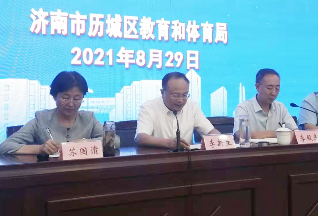 8月29日下午,历城区教育和体育局召开2021-2022学年新学期全区教育工作会议,各分管负责人安排部署了新学期各项工作,局党组书记、局长李新生进行了主题讲话,提出下半年历城教育要应对“5个新形势”,坚持“6个坚定不移”,努力交出人民满意的“5张高质量答卷”。