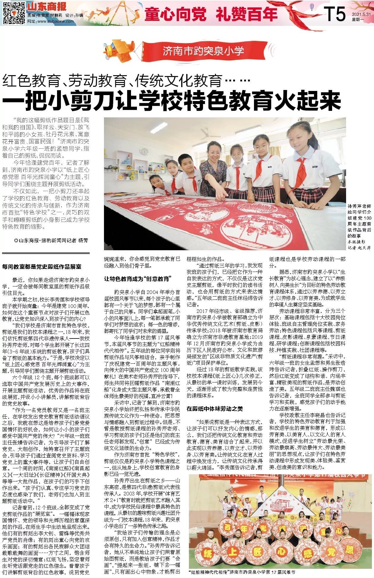 今年恰逢建党百年,记者了解到,济南市趵突泉小学以“纸上匠心感党恩 百年光辉润童心”为主题,引导同学们围绕主题开展剪纸活动。不仅如此,一把小剪刀还串起了学校的红色教育、劳动教育以及传统文化的传承与创新,作为济南市首批“特色学校”之一,灵巧的双手和嚓嚓剪纸的小身影已成为学校特色教育的缩影。