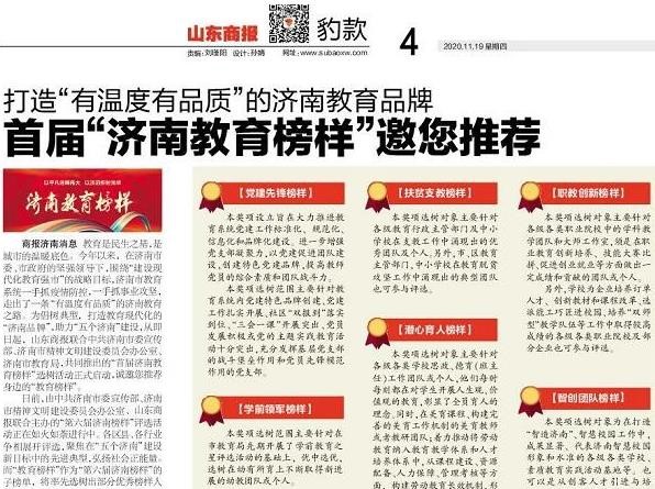 2020-11-19首届济南教育榜样选树范围主要包括:遵纪守法,热爱党和国家,自觉践行社会主义核心价值观,在全力推进济南教育高质量发展中奋勇拼搏,做出